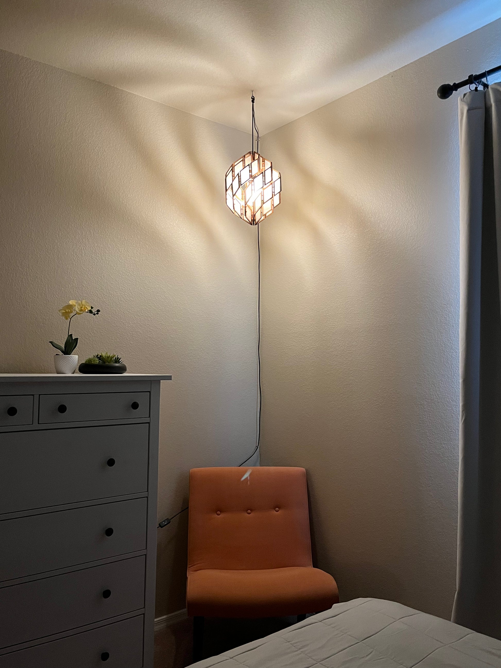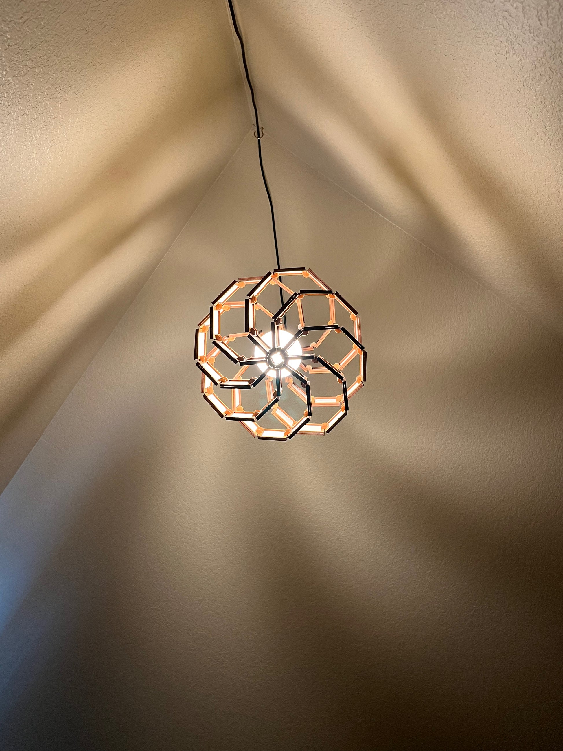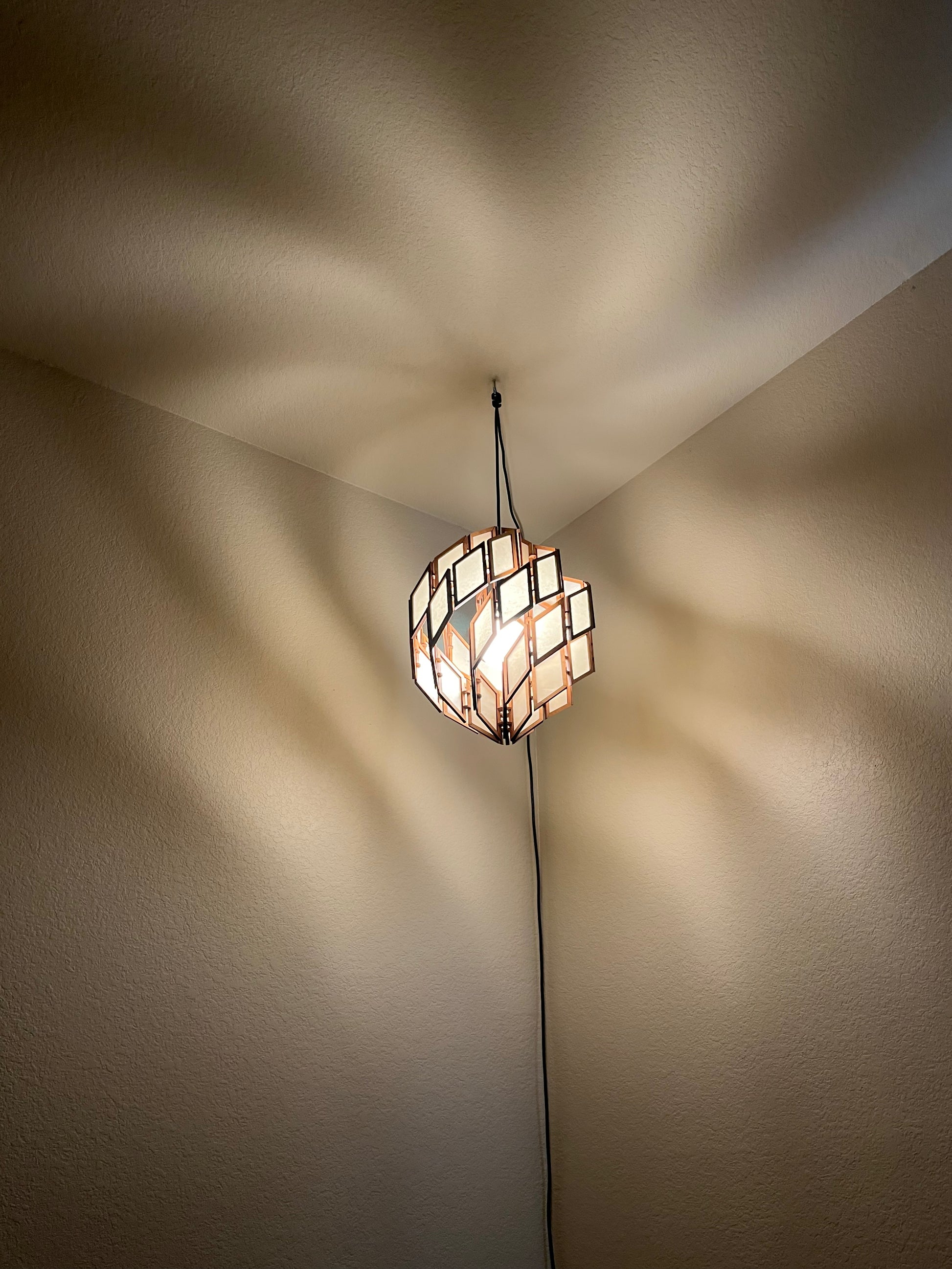 The Galaxy Lamp series explores a particular set of shapes (for the math nerds out there: polar zonohedra) that feature spirals on their surfaces. By extruding these spirals down from edges of the outer shape, I create a simple-yet-complex dance of multiple spirals starting and ending at two common points.