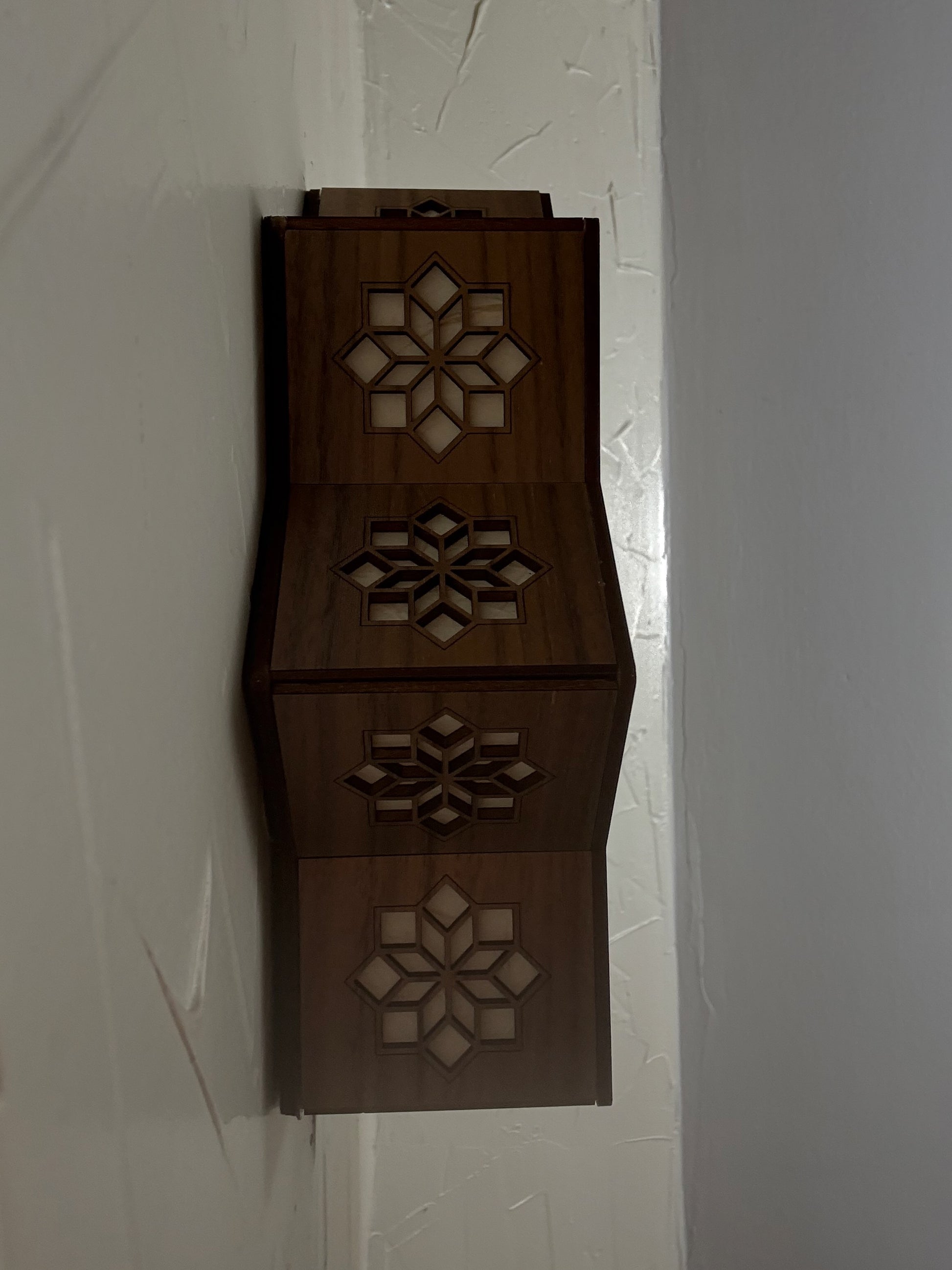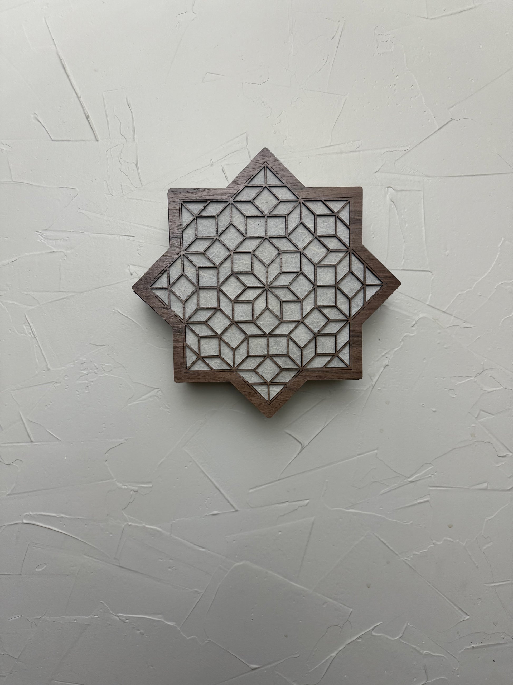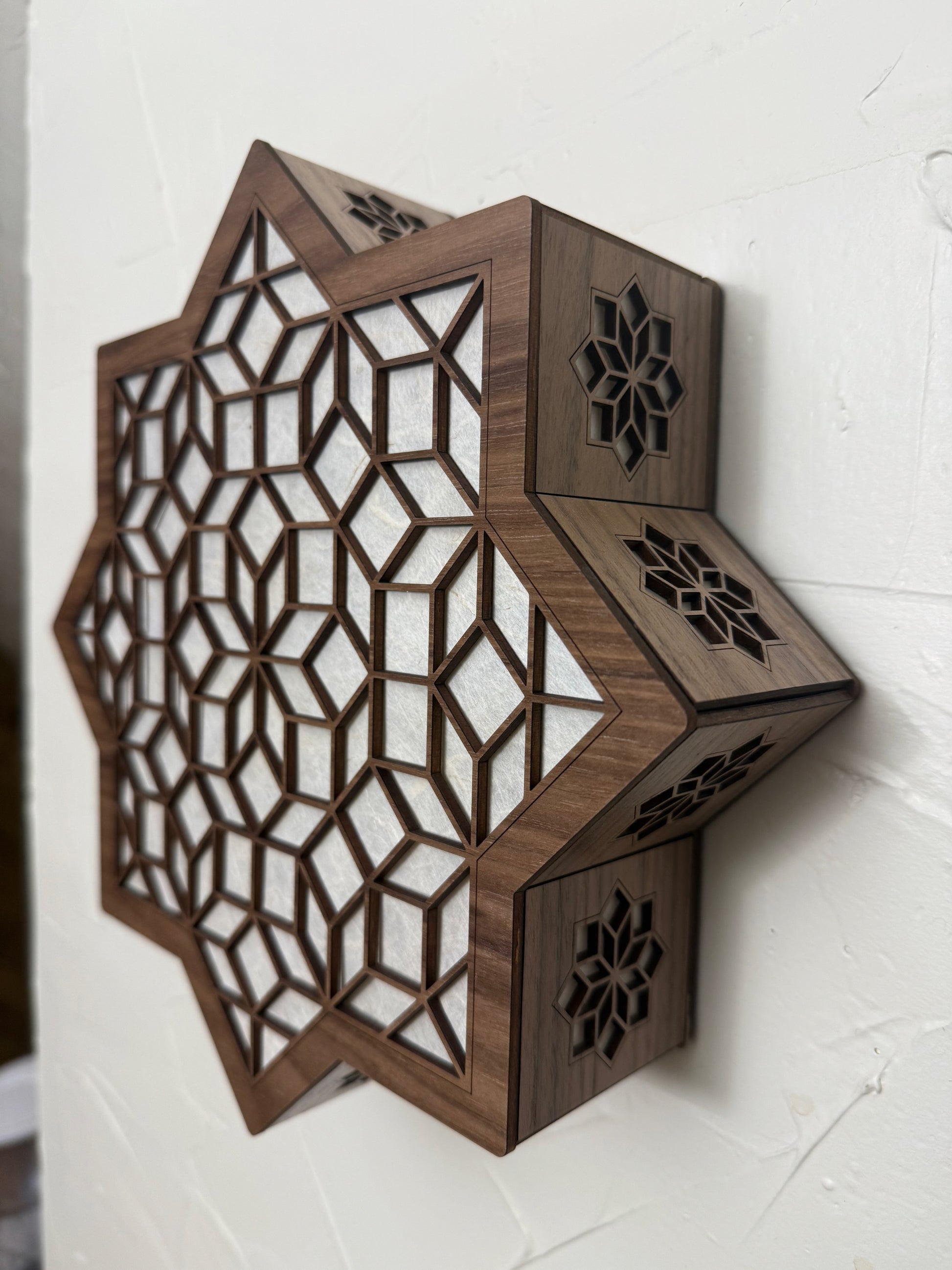 Glow Lamp - Amman is one of a new line of sconce lamps. This model celebrates a famous tiling co-created by mathematician Robert Ammann. Smaller copies of the center decorate all of the sides, letting light play along the surrounding wall as well as out into the room.