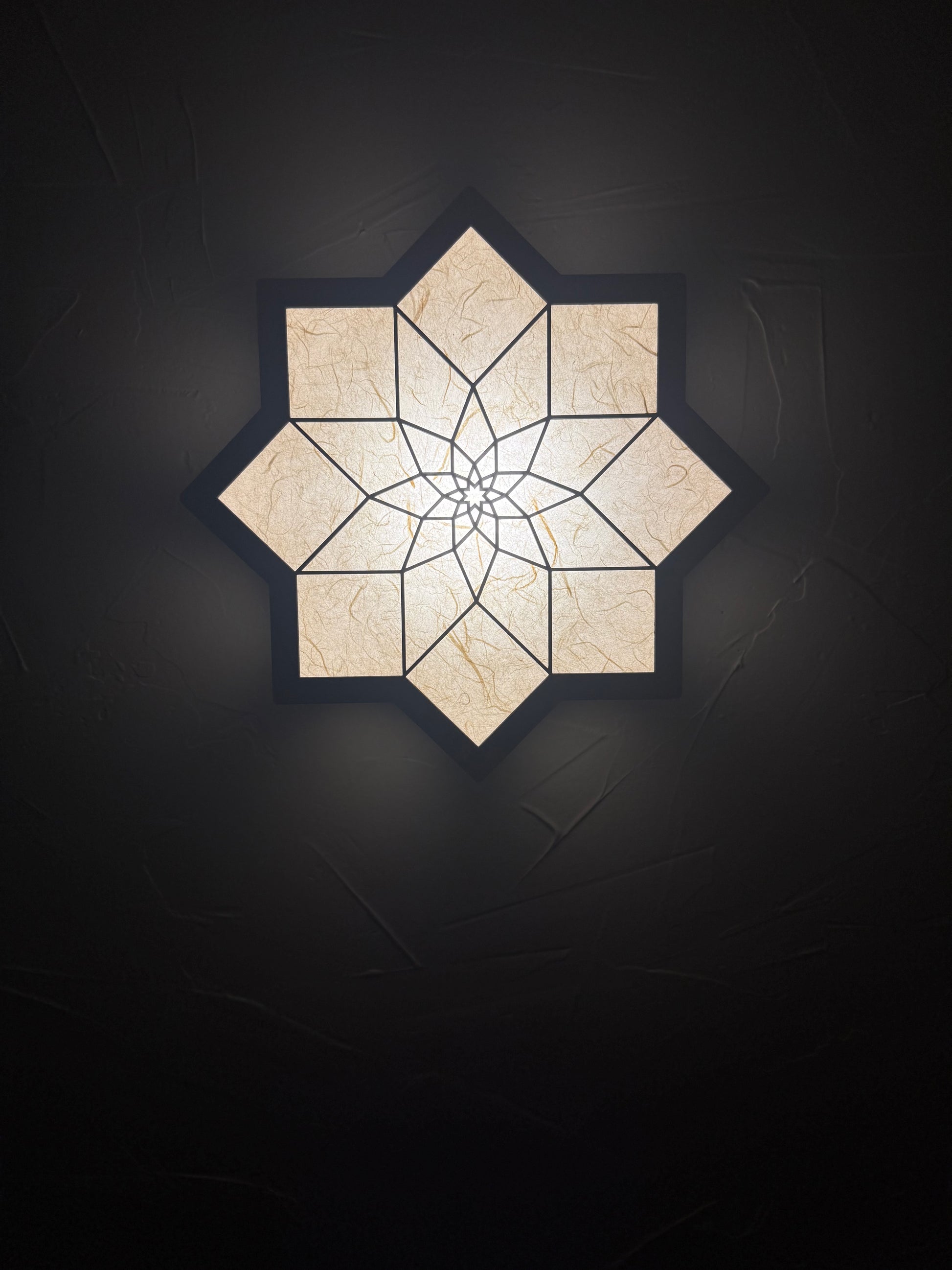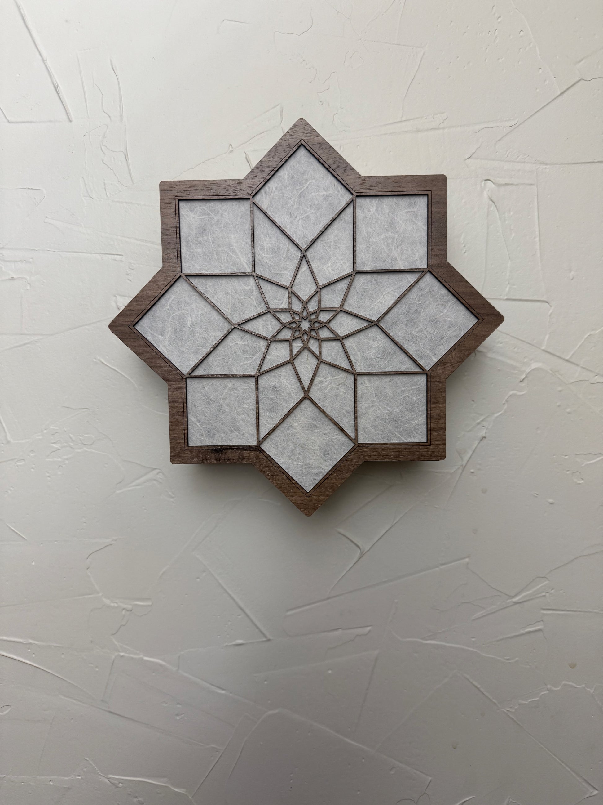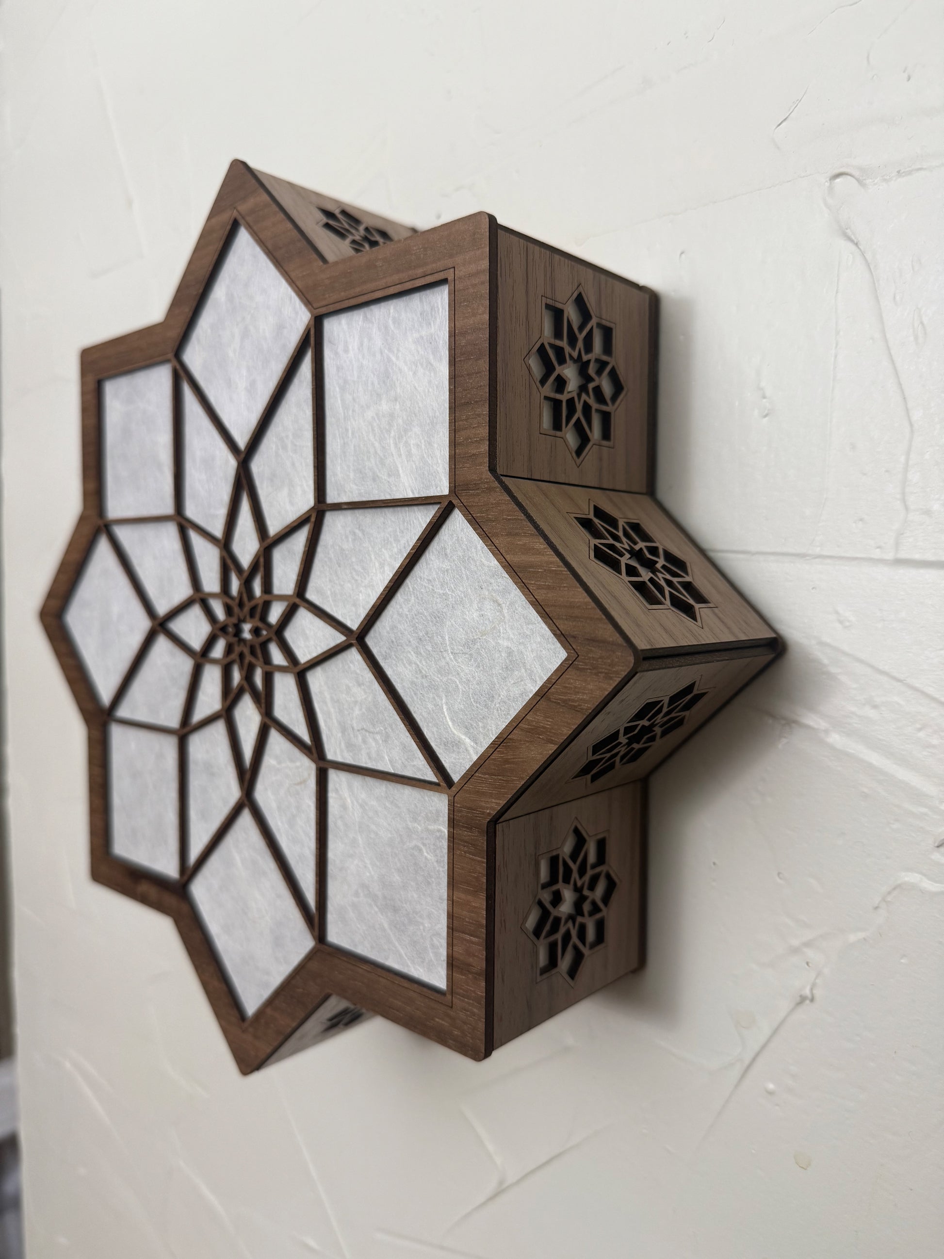 Glow Lamp - Daisy is one of a new line of sconce lamps. This design evokes a flower blooming. Smaller copies of the pattern decorate all of the sides, letting light play along the surrounding wall as well as out into the room.