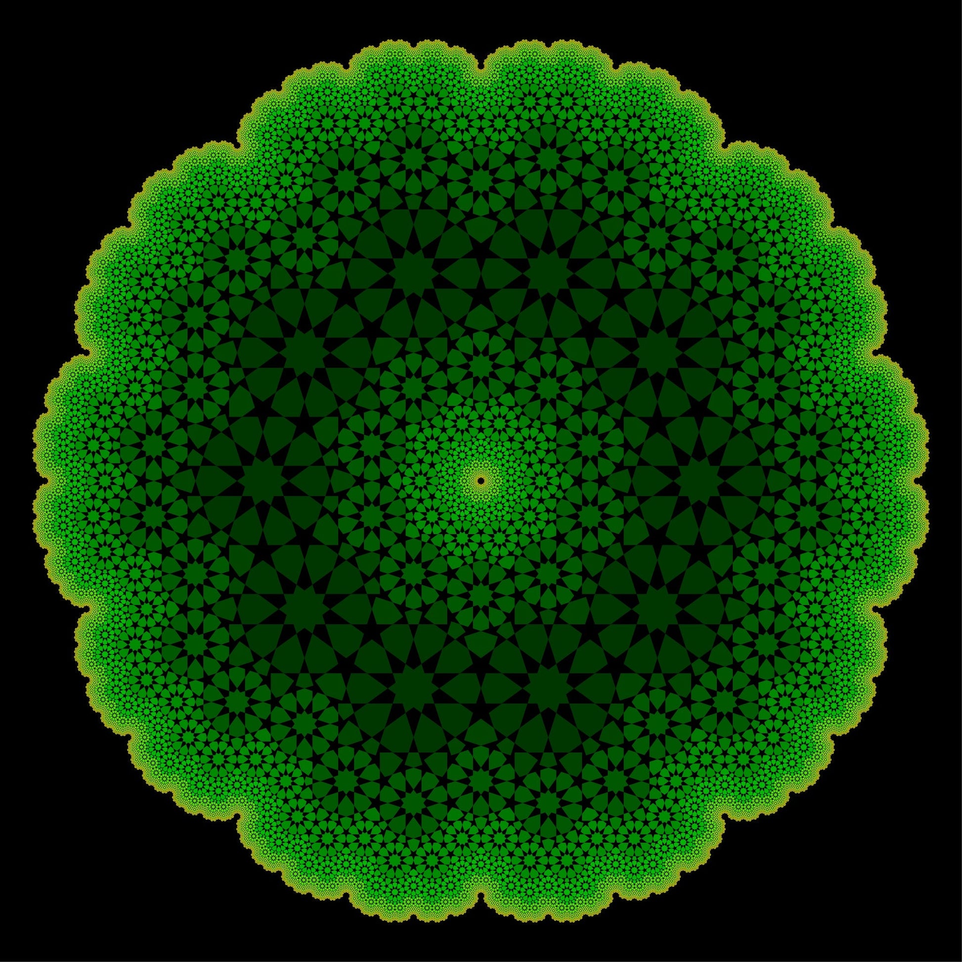 Infinity Bloom 10 has geometry centered around 10-fold symmetry. It appears in the number of petals in each rosette, as well as the number of rosettes in the largest ring.