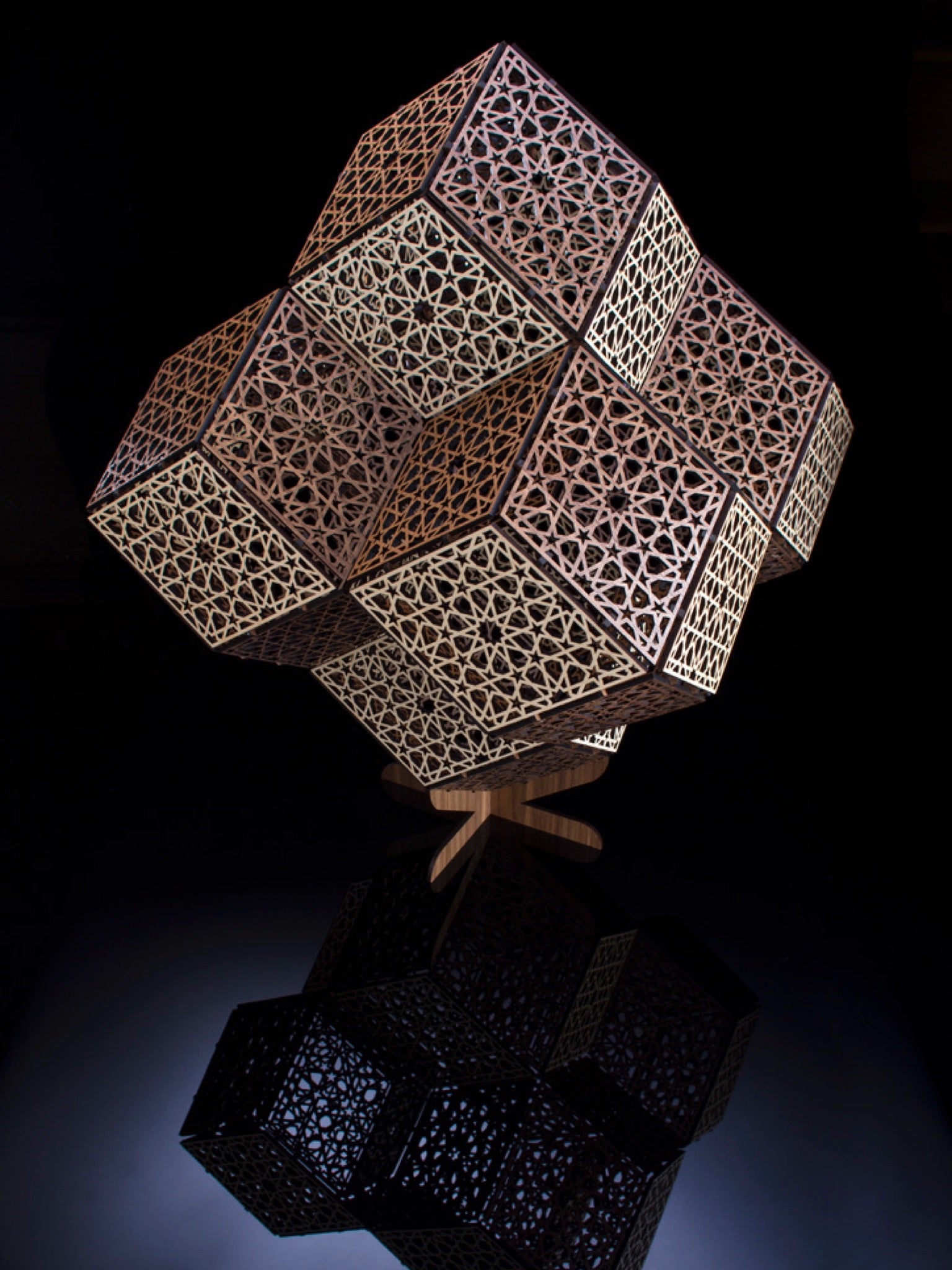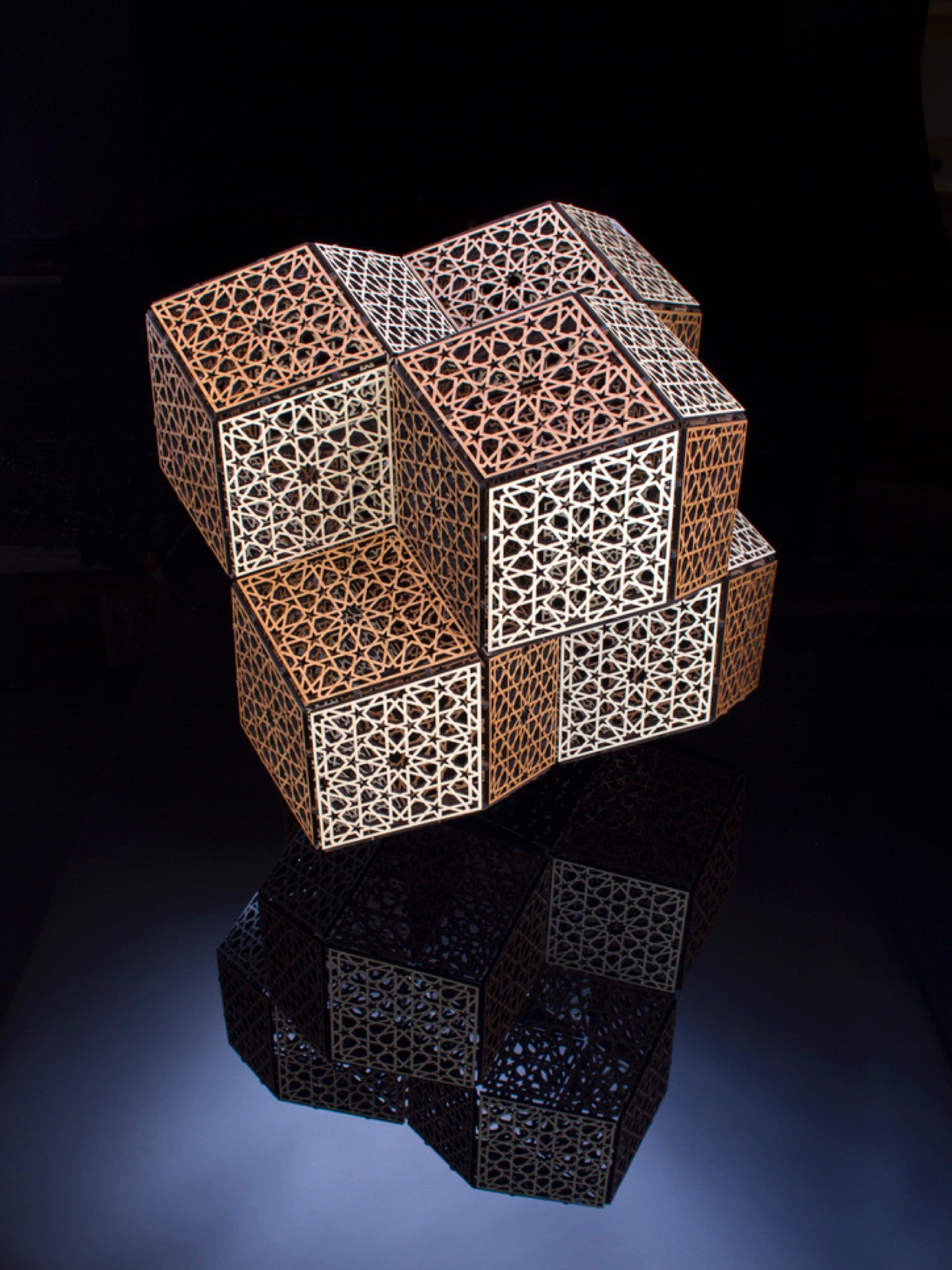 Jaali Diamonds 1 has the exterior shape of a grouping of shapes known in math circle as "rhombic dodecahedra." Each face is decorated with a well-known pattern featuring 10-petaled rosettes.