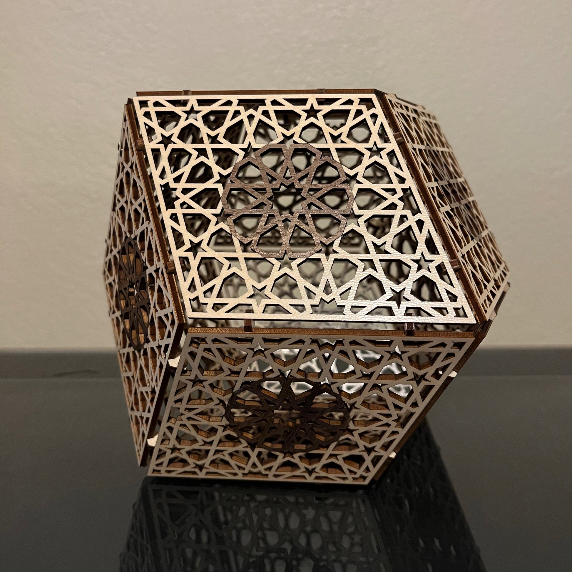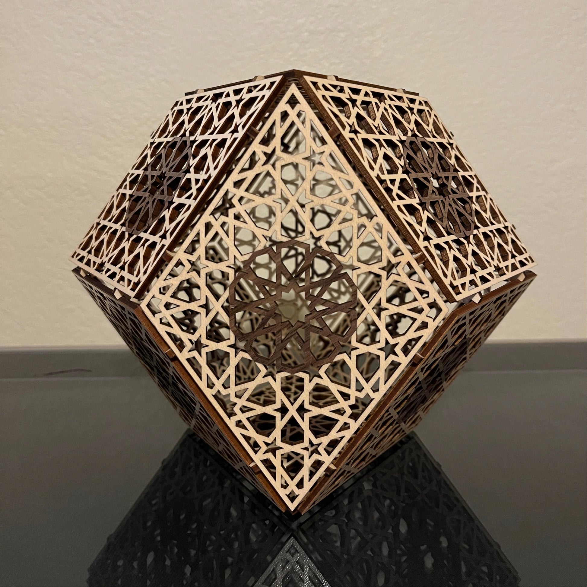 Each face is decorated with a pattern featuring 5-pointed and 10-pointed stars. In the case of Jaali Fellow 2, all the faces are made out of the one color of wood with central rosette inserts of a contrasting color of wood.
