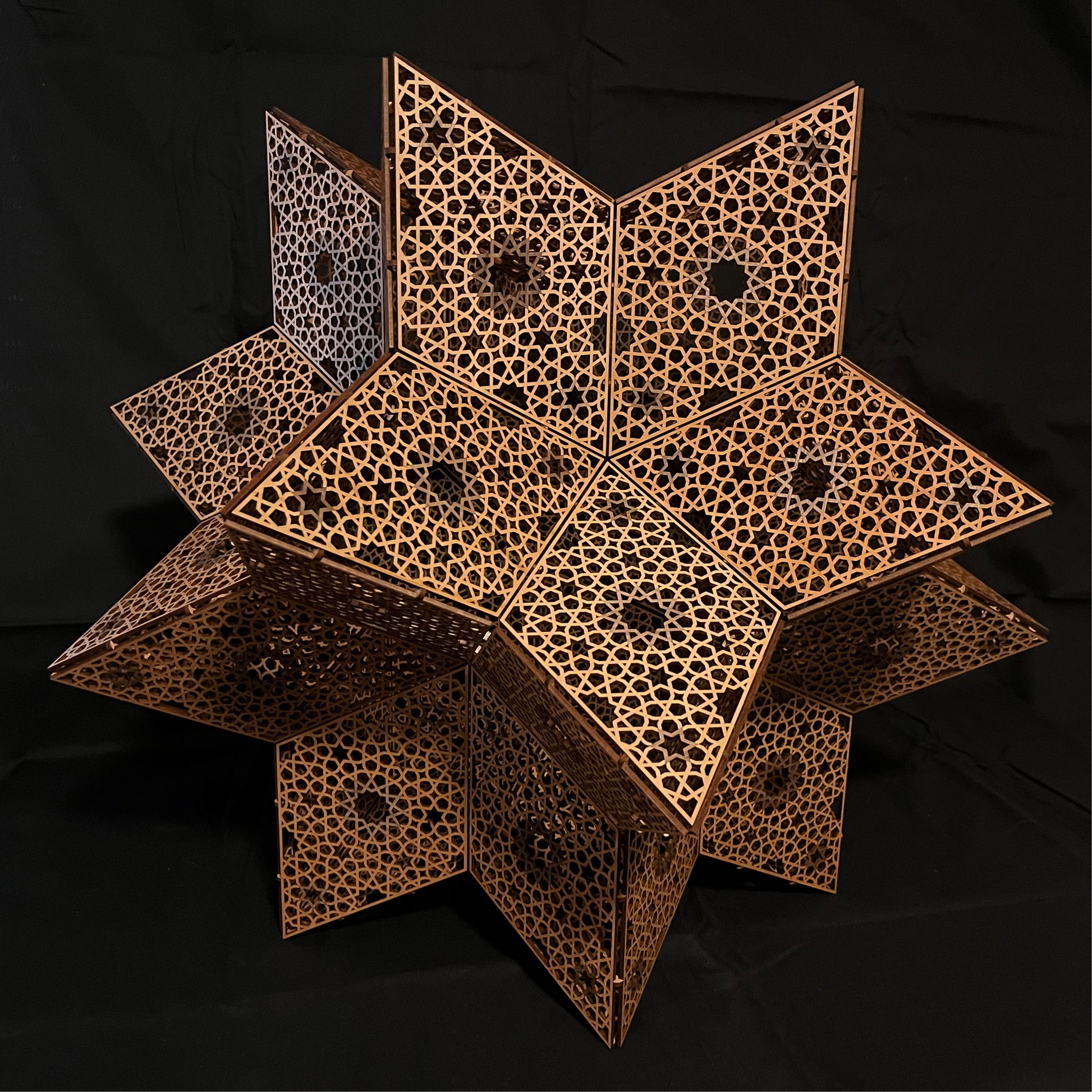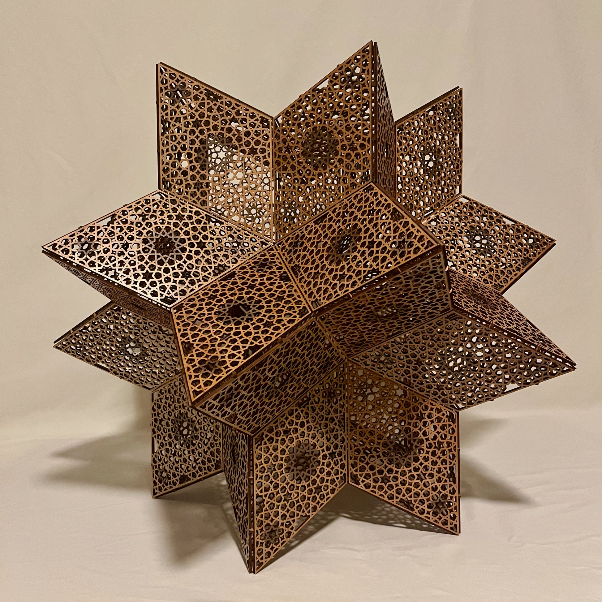 Jaali Star has the exterior shape of a polyhedron with the fancy-schmancy name of a "rhombic hexacontahedron." (All this means is that it has 60 faces, all of which are rhombuses. Those Greeks and their fancy words!)