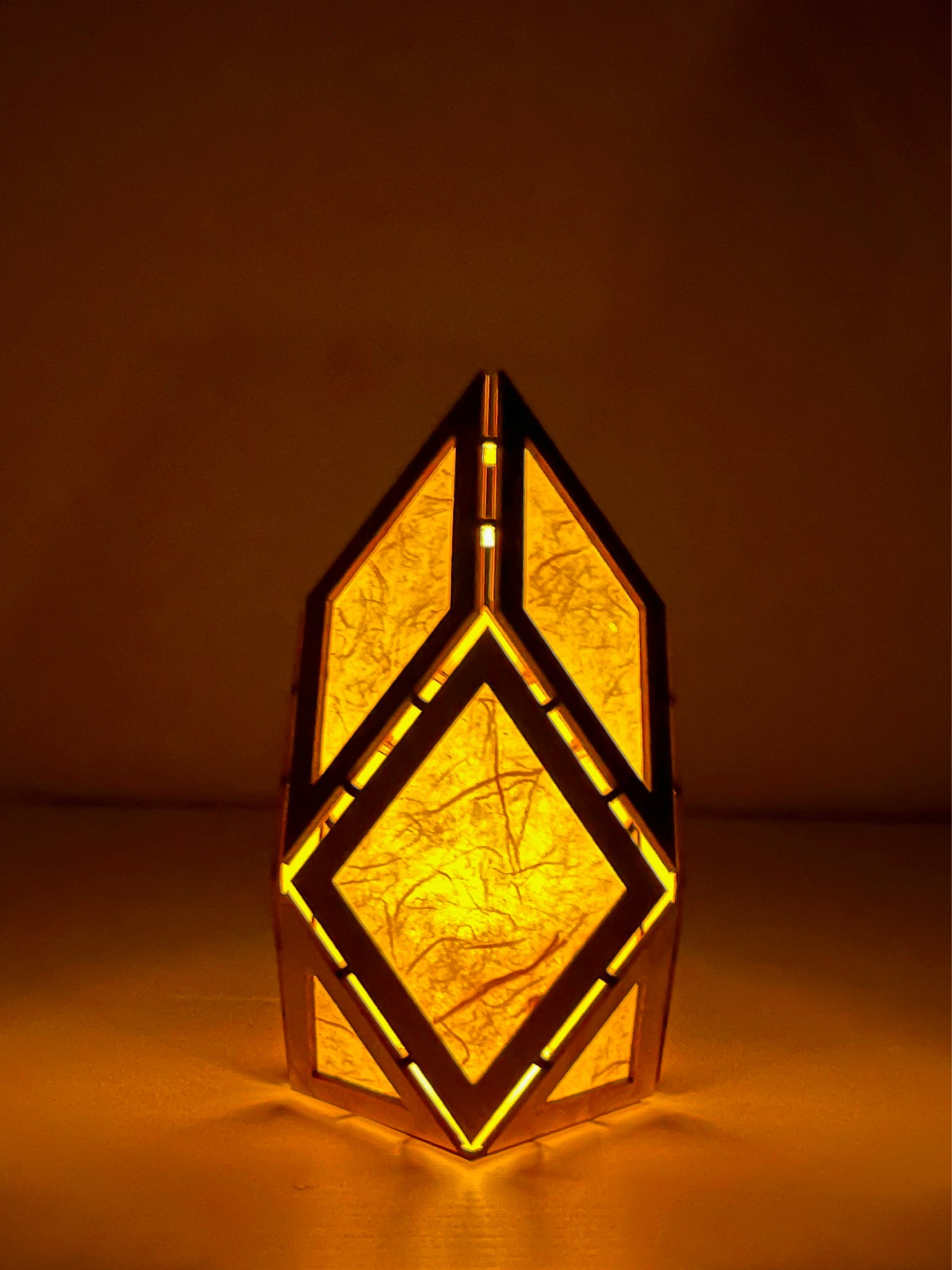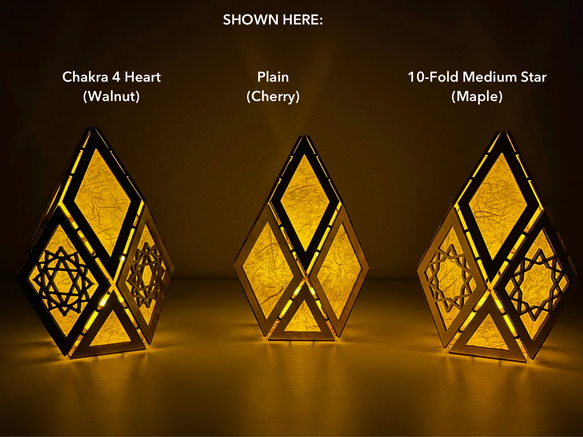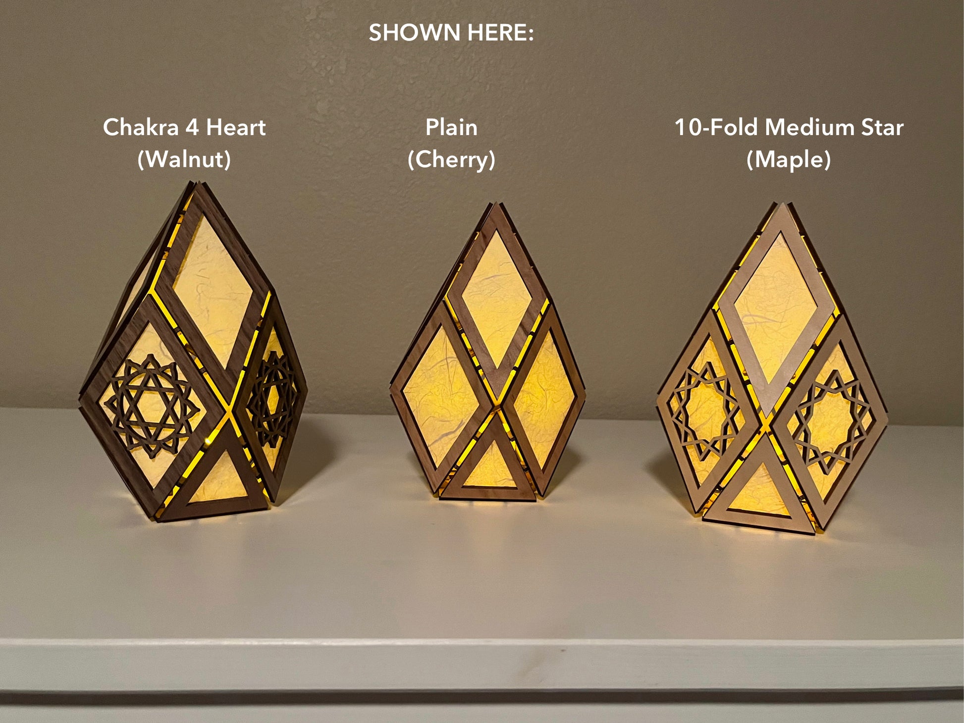 The Opal Mini series are small Jewel Lamps designed to fit over an electric candle. They bring a soft, warm, flickering glow to your room, and are available in a variety of heights, wood tones, and patterns.