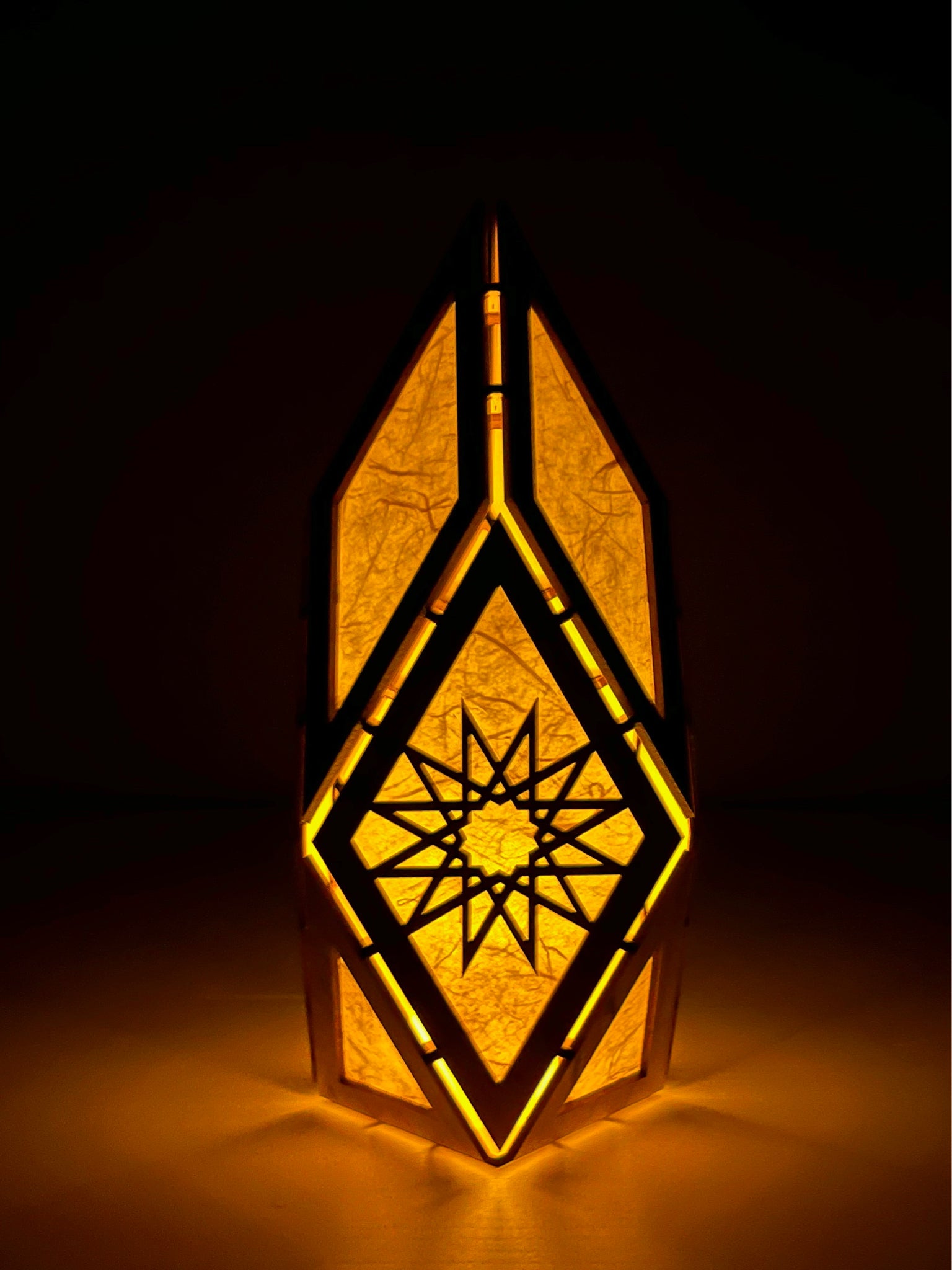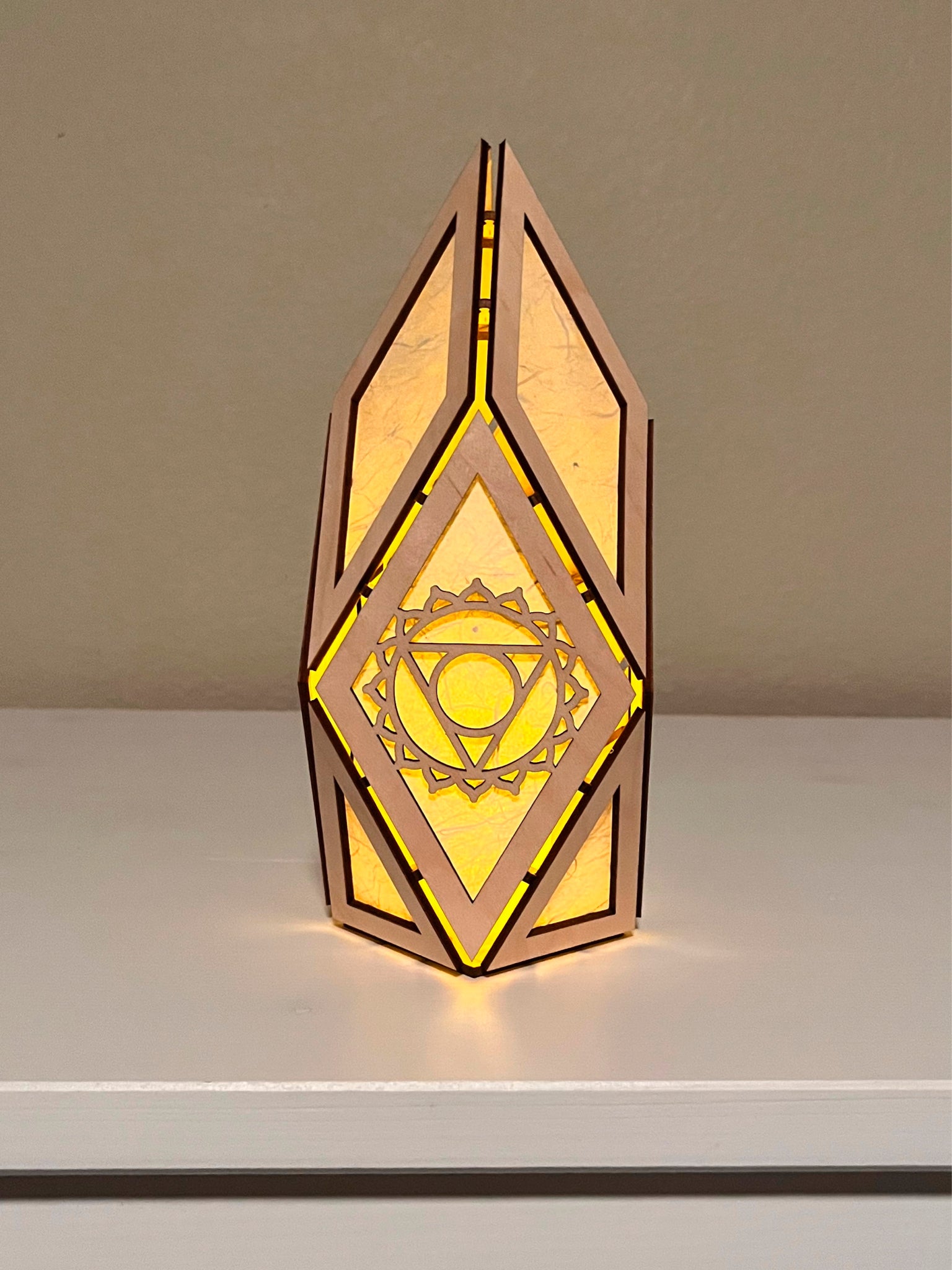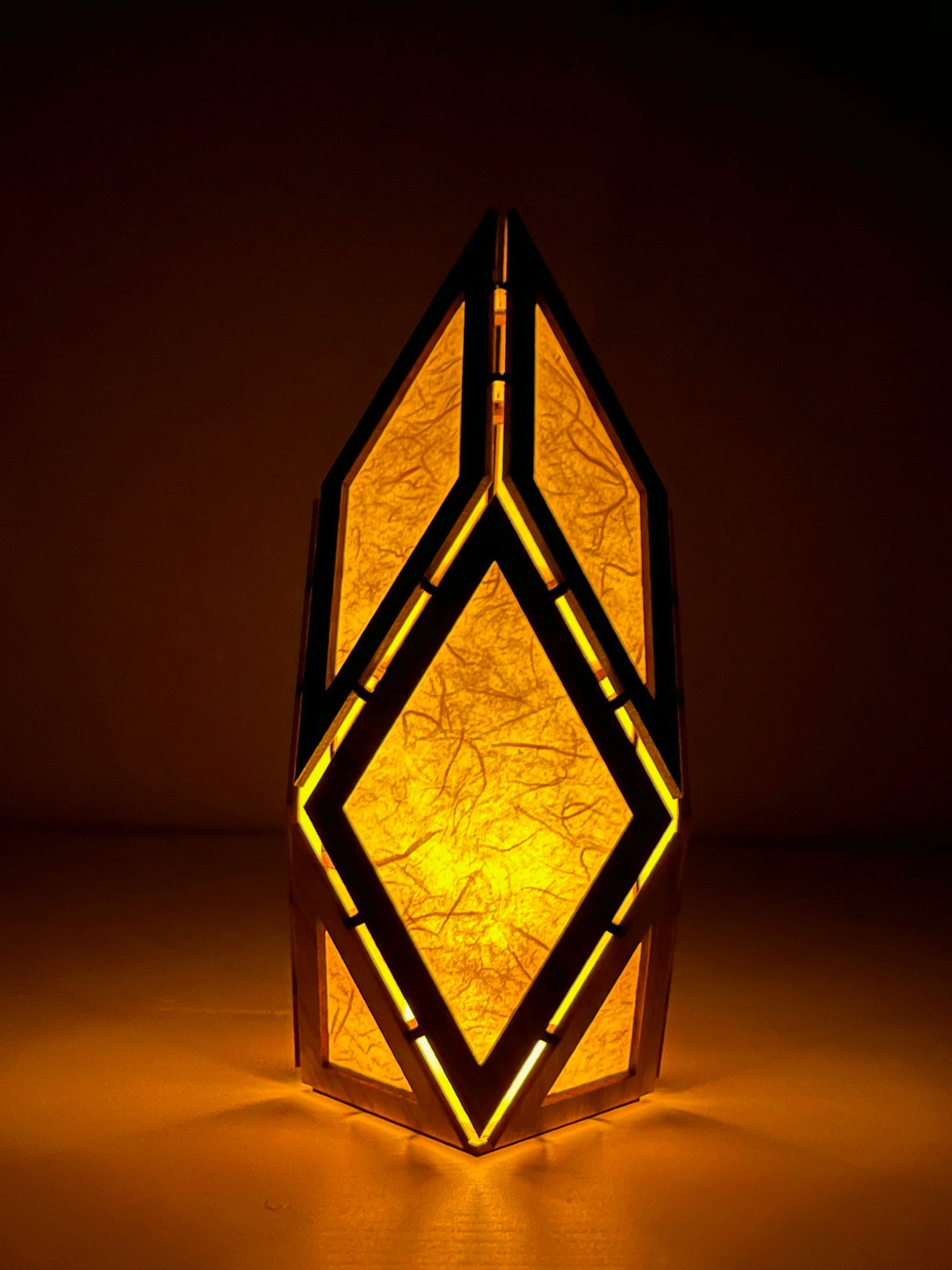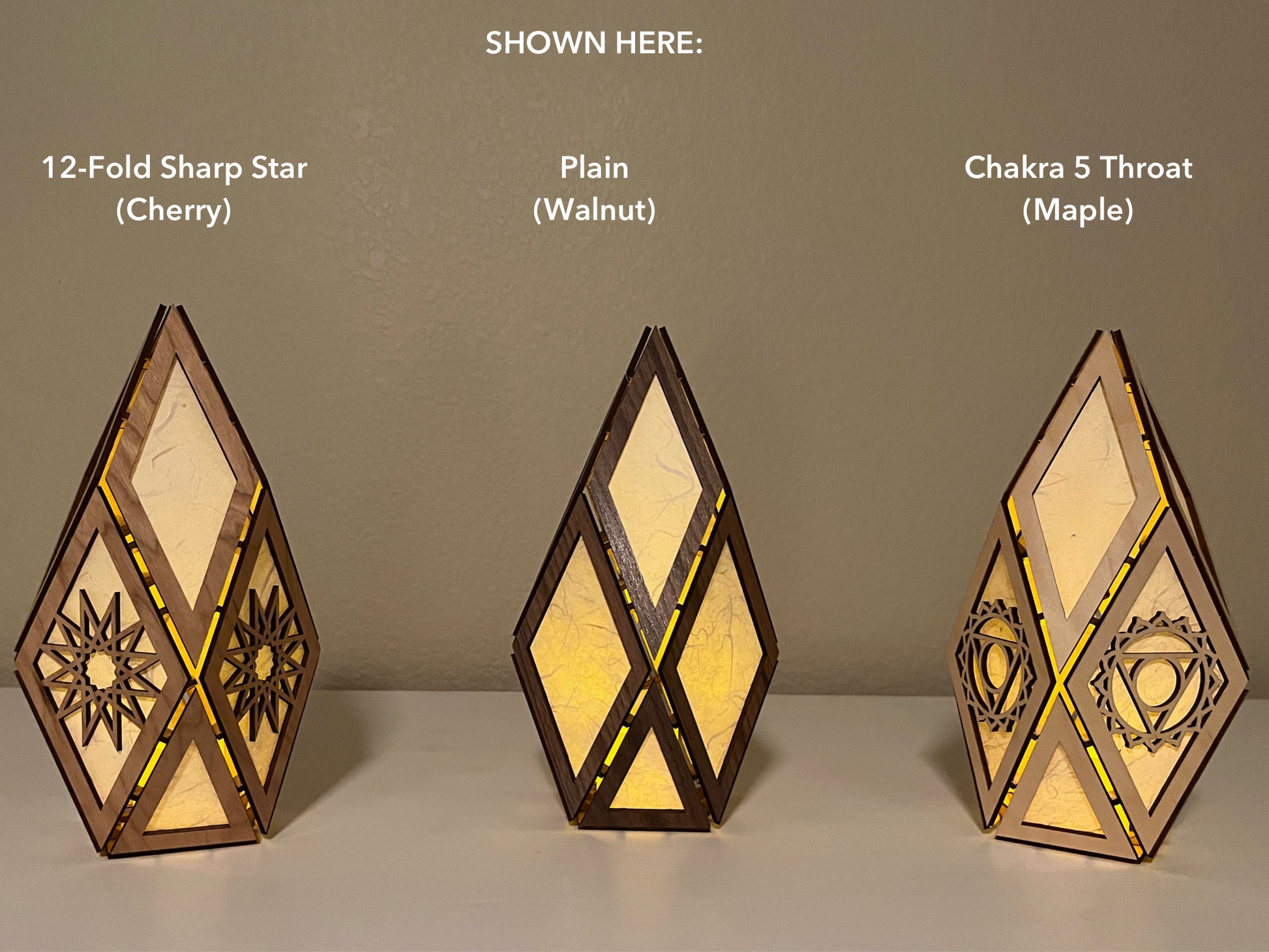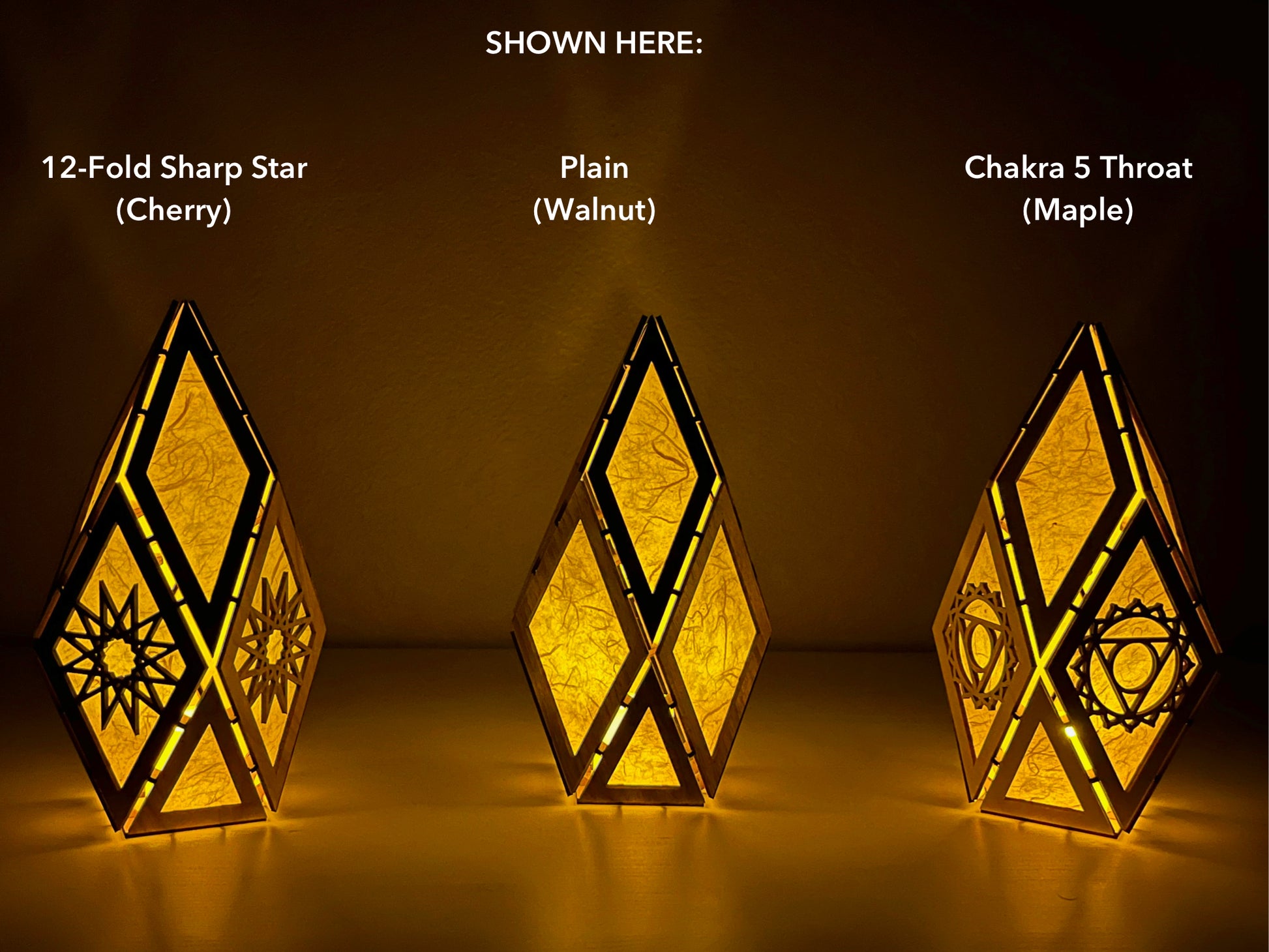 The Opal Mini series are small Jewel Lamps designed to fit over an electric candle. They bring a soft, warm, flickering glow to your room, and are available in a variety of heights, wood tones, and patterns.