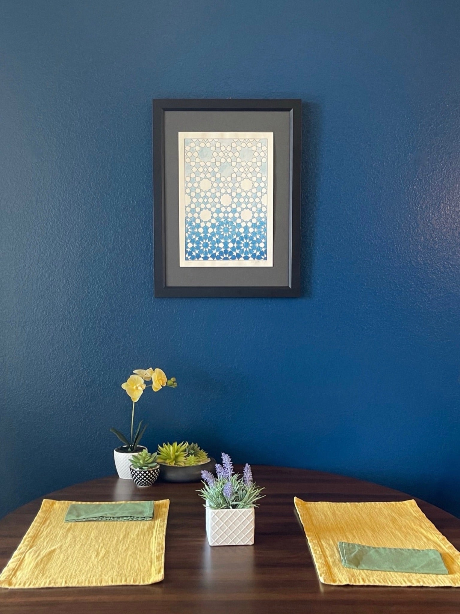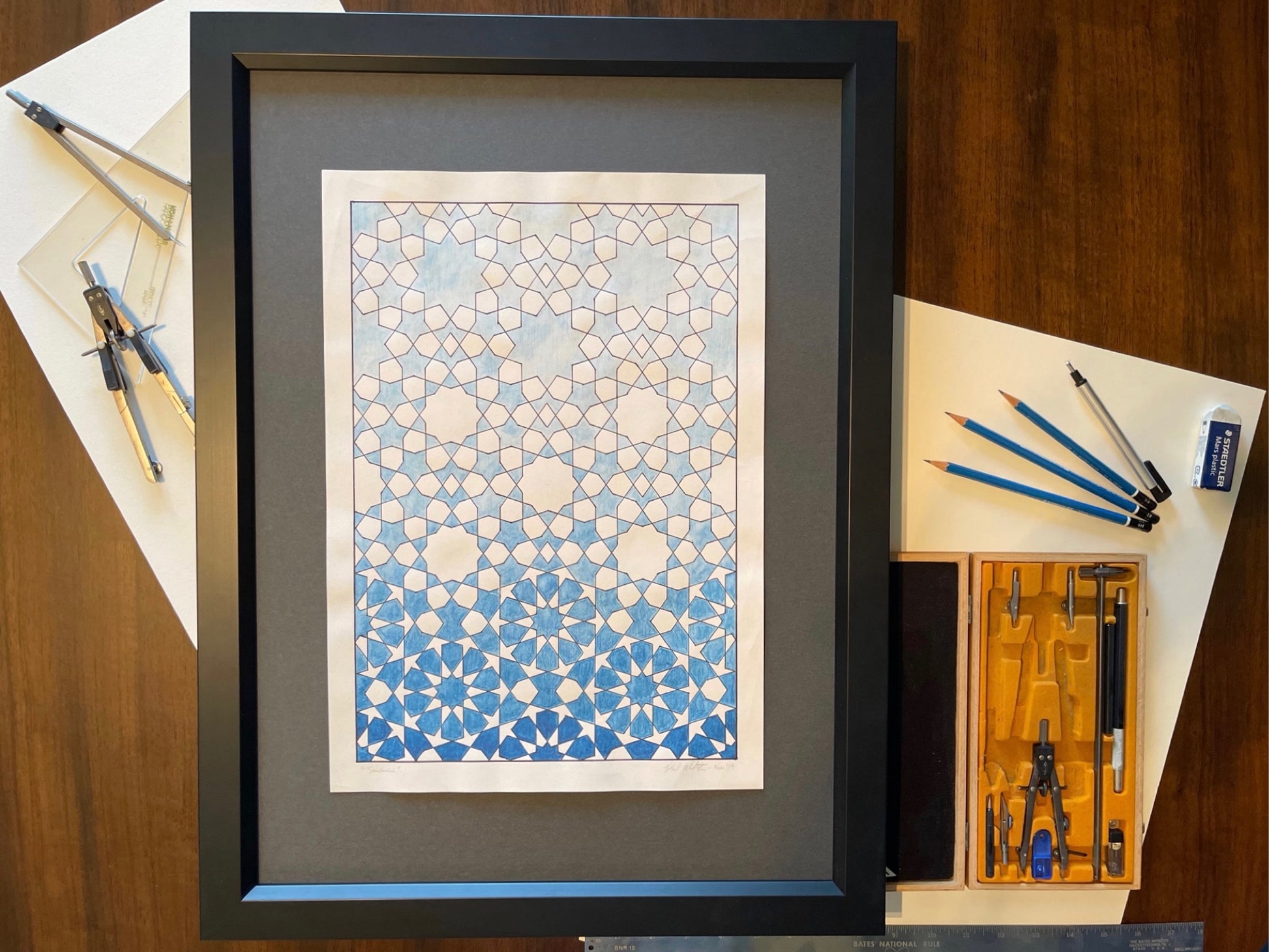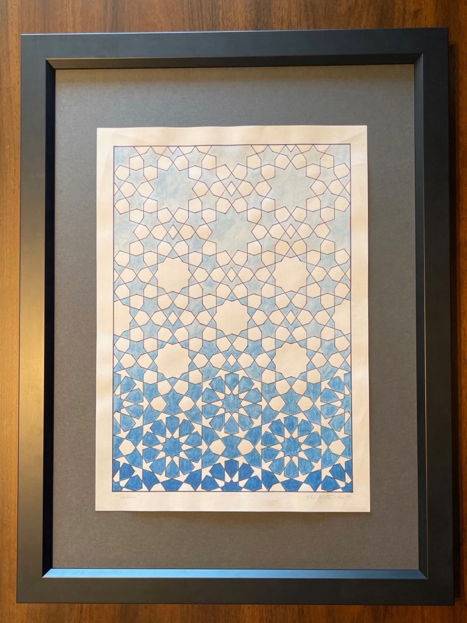 This pattern slowly transforms from a light, airy weave at the top to a much denser pattern at the bottom. The entire pattern was constructed by hand using only straightedge and compass, then outlined in pen and colored with a single watercolor hue, varying only in intensity from top to bottom.