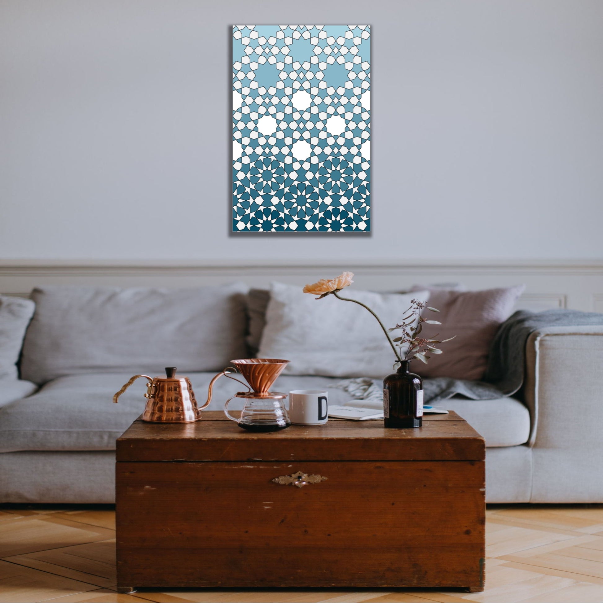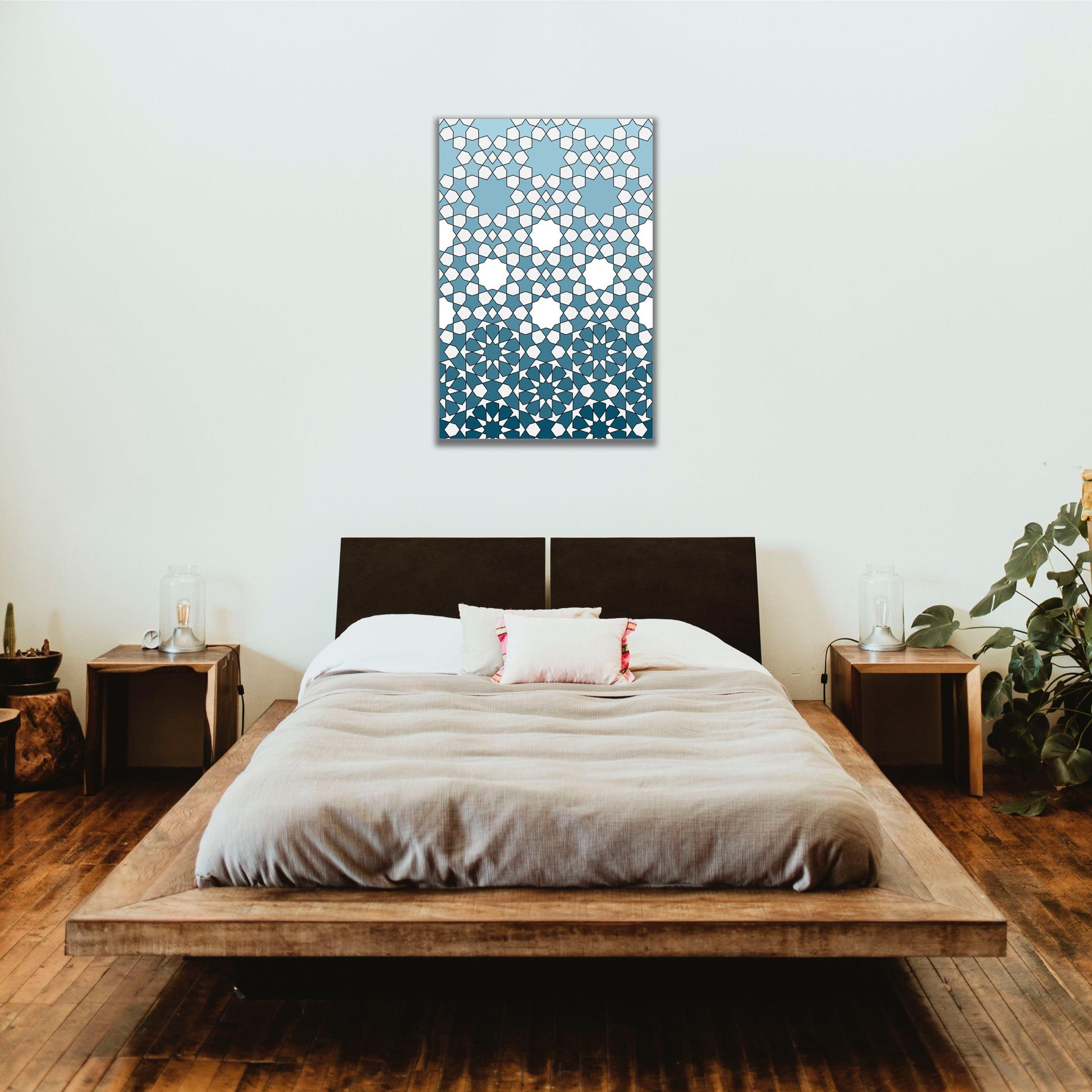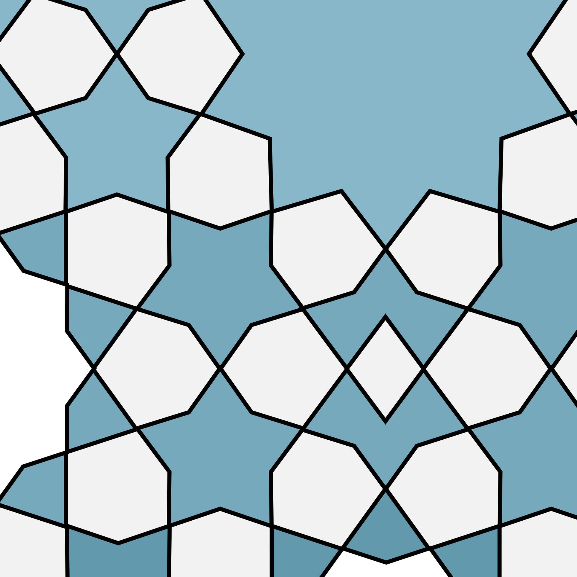Santorini originated as a hand drawing in pen and watercolor, all in blue. We had just visited Santorini and the morphing from dark blue to almost-white reminded me of the colors there. The pattern itself is based on traditional 10-fold Islamic patterns, and was study of sorts for me, to explore the relationships between several patterns in this family that share the same underlying structure.