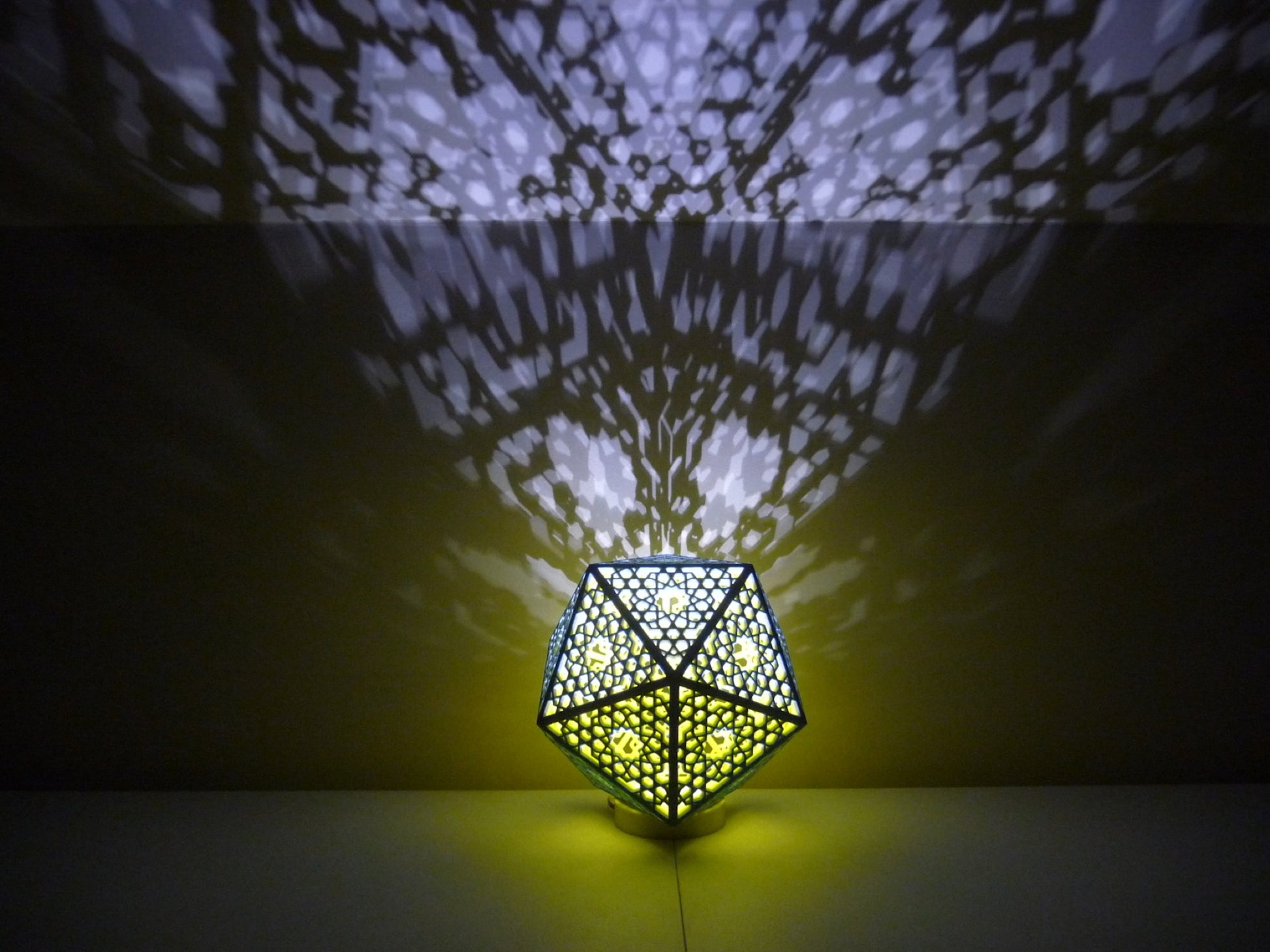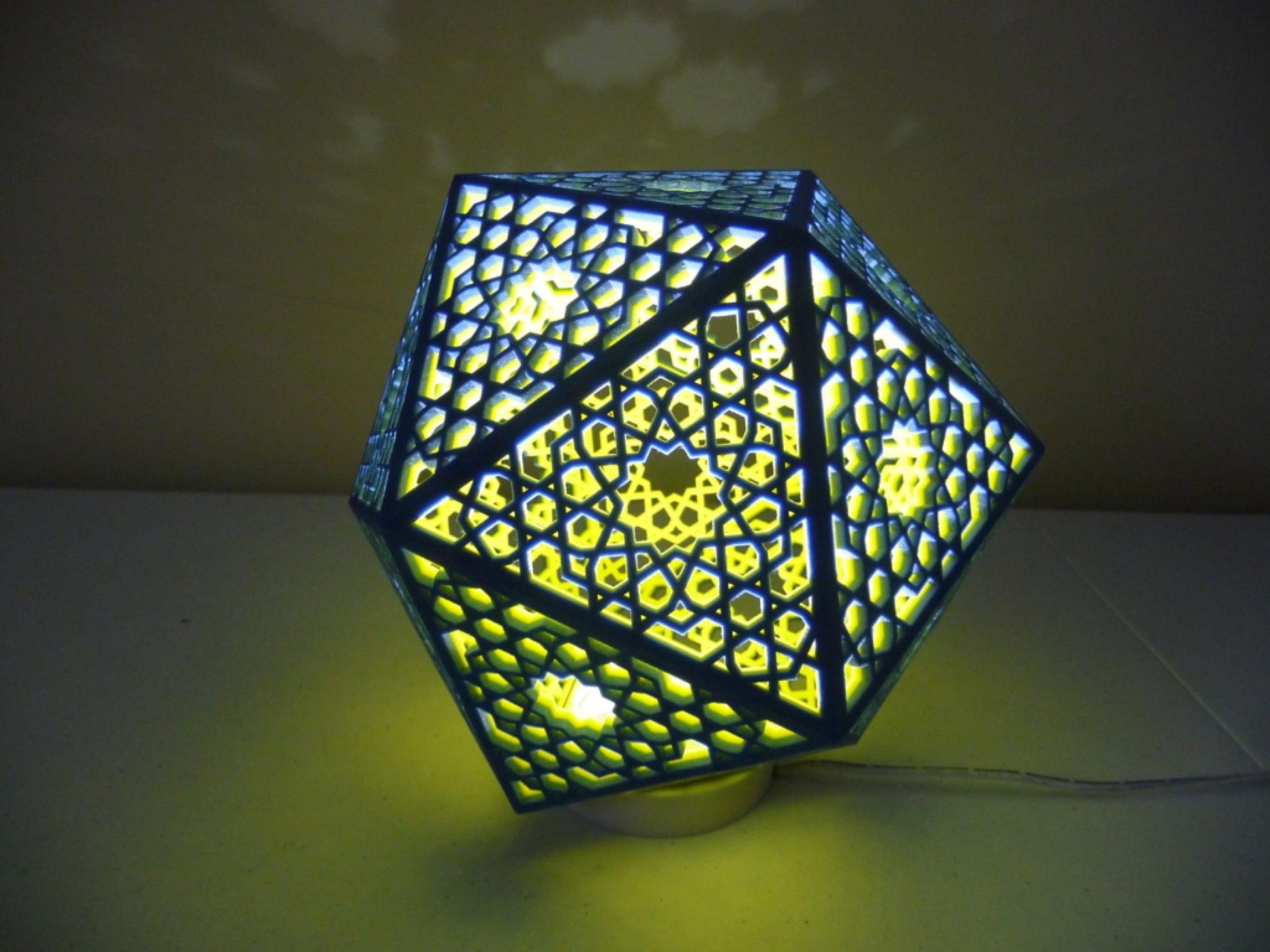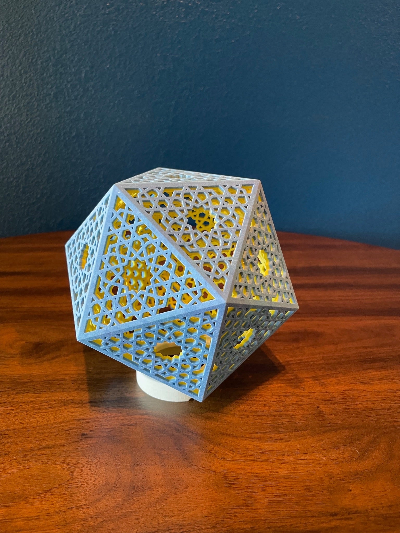 The geometry of this piece is formed by applying a traditional, hexagonal-repeat Islamic pattern to the faces of a regular icosahedron. The 6-fold rotational centers of the original pattern that land in the centers of the faces remain intact, while those that land at the vertices "lose" 1/6 to become 5-fold.