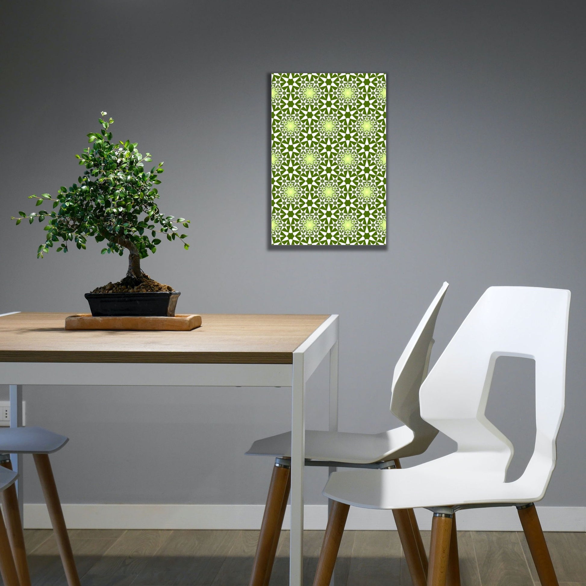 Shades from moss green to light yellow emphasize the geometric progression and give the piece a visual vibration reflected in the name. This piece creates a distinctive energy in any room.